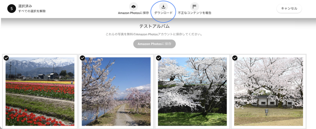 ダウンロードしたい写真を選び、チェックマークを付けると、上に「ダウンロード」のボタンが表示されます。
